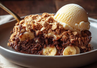 Our signature dessert—an indulgent slice of warm chocolate crumble cake, rich and dense with just the right touch of crisp. Plated over fire-roasted banana coins and crowned with a melting scoop of sweet cream ice cream. A messy masterpiece and proud staple of the house. Ask for it early—we run out often.