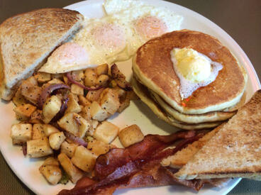 A true Lominsan lumberjack’s breakfast—two hardy eggs, seared thick-cut ham from the Hinterlands, wood-smoked bacon cured in the style of the Black Shroud, and a generous heap of crisped popoto wedges. All of it laid atop fluffy Thanalan griddlecakes and drowned in dark Gridanian maple syrup. Forks required. Naps encouraged. Breakfast is a state of mind, not a time.