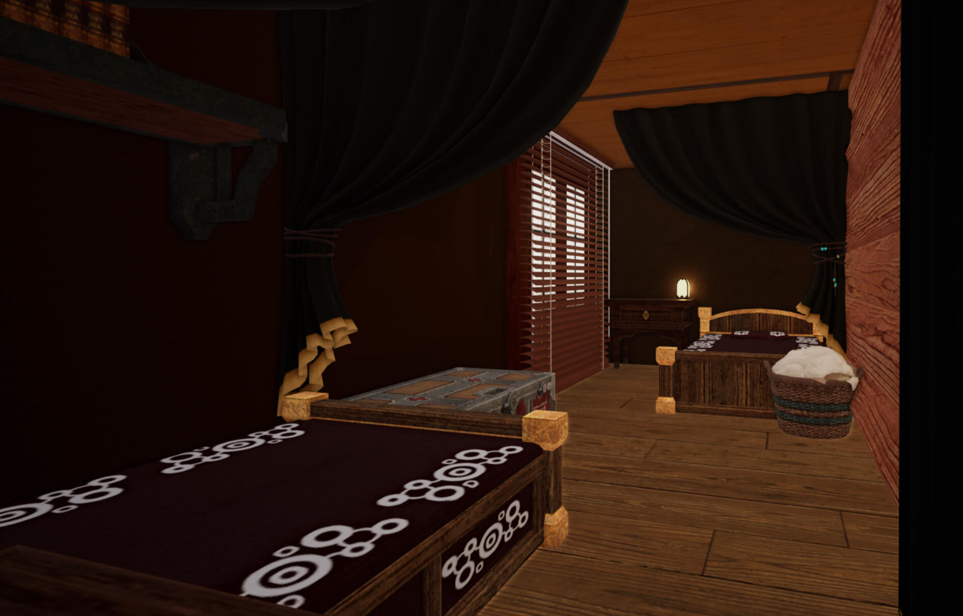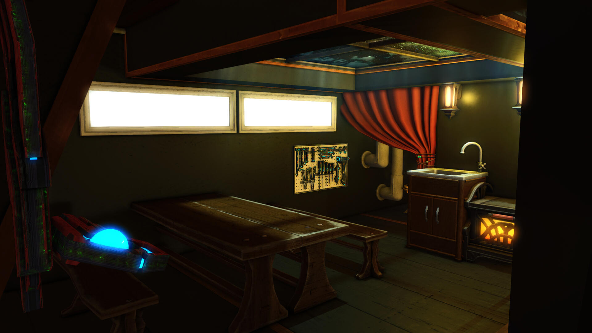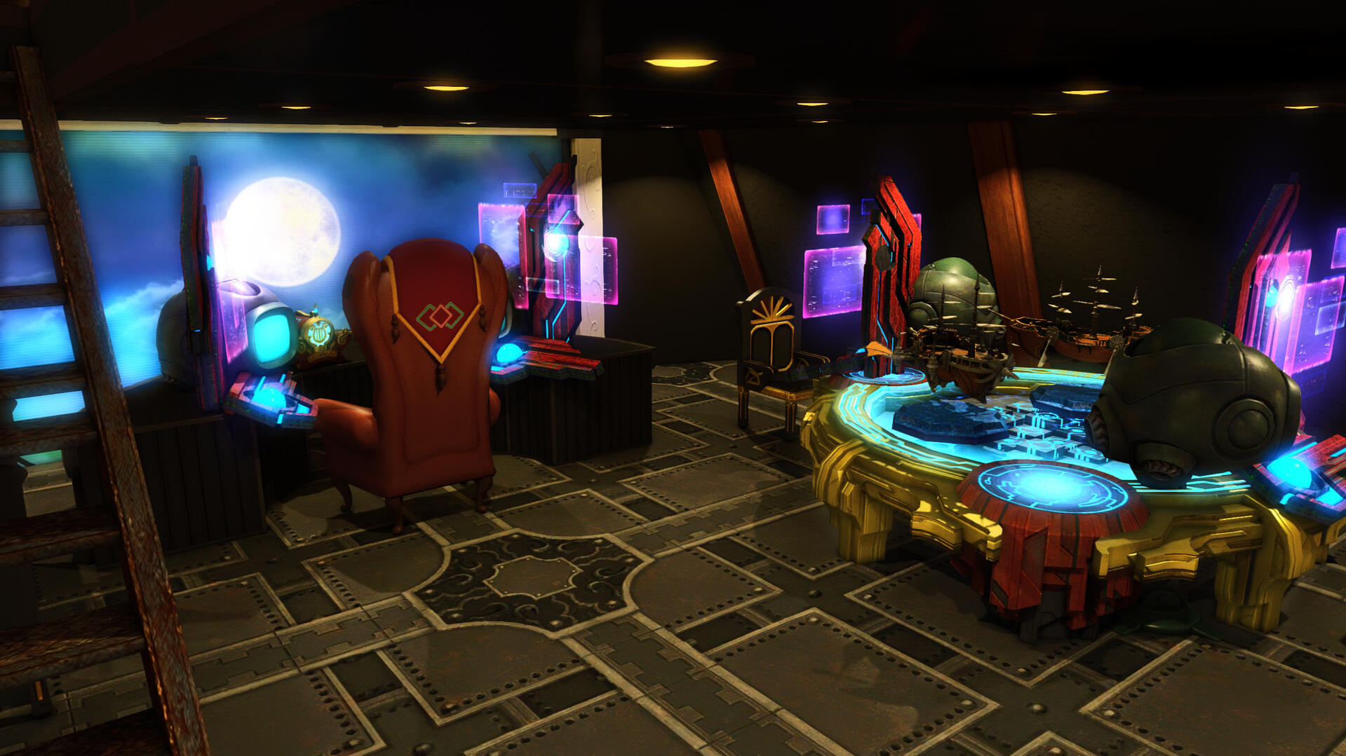Another personal project, this design followed the loss of the League’s original airship cabin — a rustic, salvaged space that had served its purpose well. The new build was something else entirely: sleek, advanced, and purpose-built to reflect the League’s growth. Yem worked closely with her lead engineer, a sharp-minded woman known simply as Gravy, to bring the vision to life. It’s cozy, modern, and yes — it hums, just as any proper airship should.