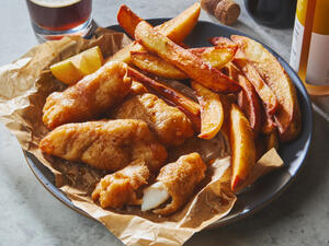 A Limsa Lominsa tavern staple—flaky haddock fillets cloaked in a crisp ale batter, fried to golden perfection. Served with thick-cut popoto wedges, just like you'd find in a dockside pub, and paired with our house Rhotano-onion tartar sauce for a savory, sea-salted finish.